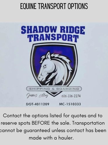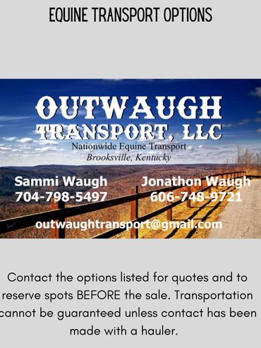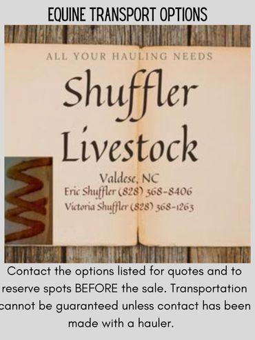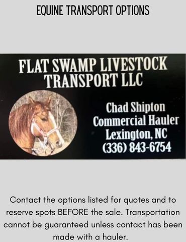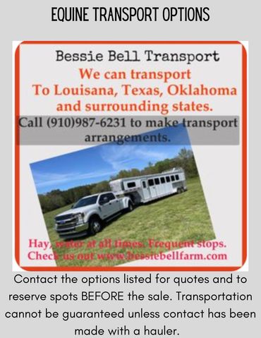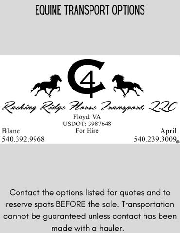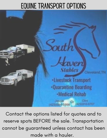 Don't have a way to get your new horse home? We have a great list of Equine Transporters that can help! If you plan on bidding, please make sure to get in touch with one of the haulers before the day of the sale. Contact them before the sale to get a quote and reserve your spot. If your hauler needs Health Papers for your horse, please let the office know when you checkout and we can arrange for your hauler to receive them.