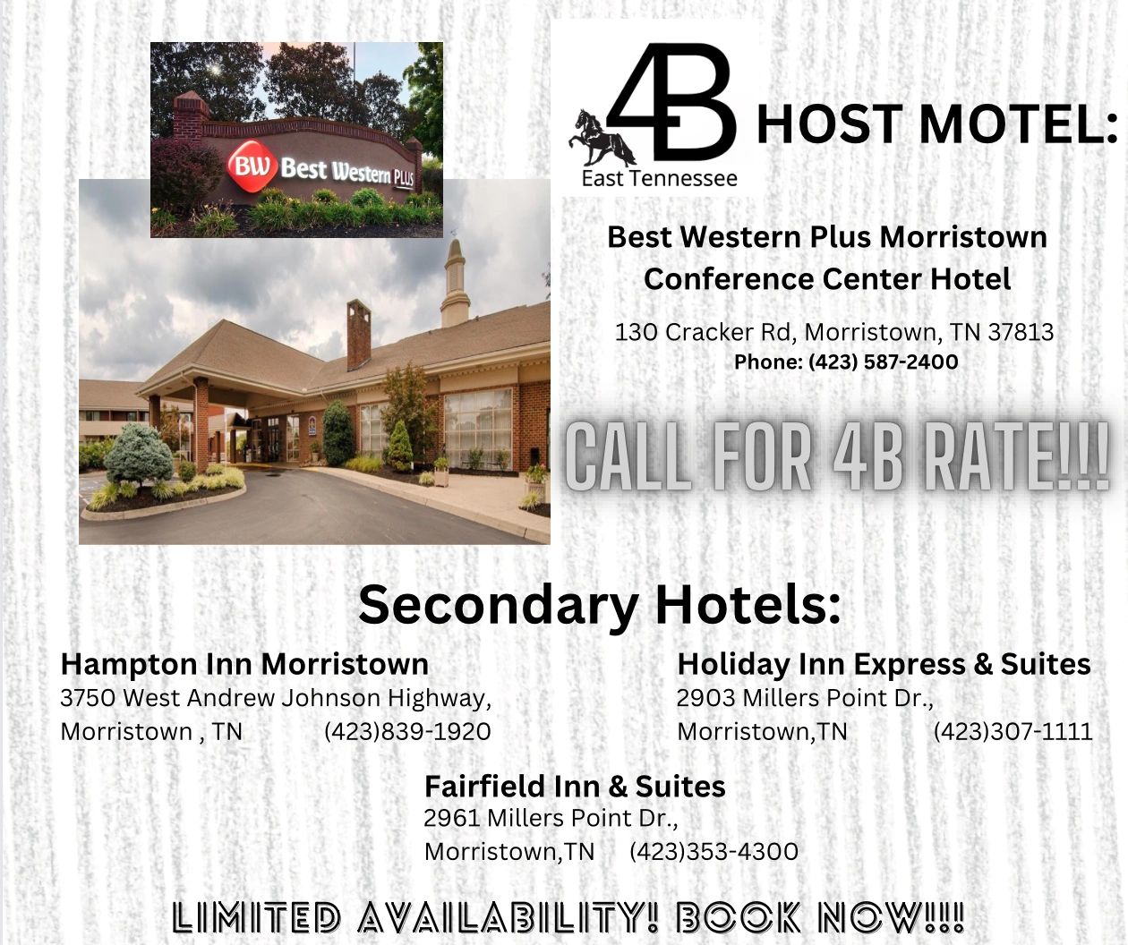 The smaller town of White Pine offers several nice hotels. Our host hotel, Best Western Plus, is just off I-81 Exit 8. Off the same exit you will find a couple other options. Ten miles down the road, in Morristown, you can find more lodging as well. There are several restaraunts and fast food choices nearby too!